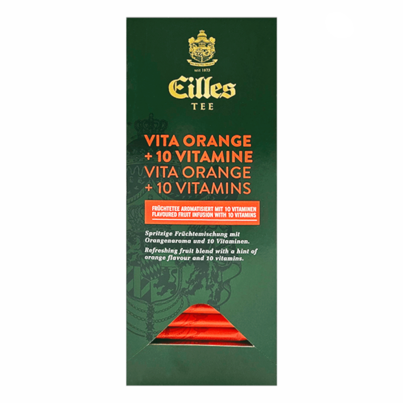 EILLES TEE Vita Orange to orzeźwiająca kompozycja jabłek, cząstek pomarańczy i cytryny, płatków hibiskusa oraz dzikiej róży. Herbata owocowa wzbogacona jest o zestaw 10 witamin. Napar Vita Orange wyróżnia się świeżym, naturalnym aromatem pomarańczy.