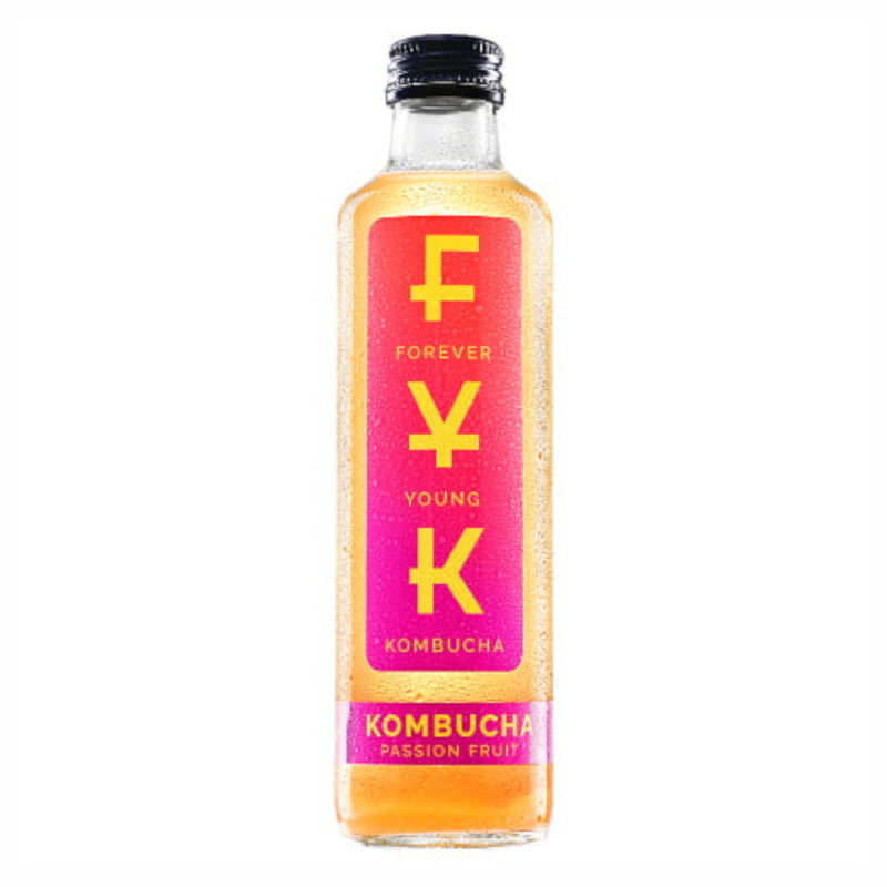 Napój na bazie fermentowanej, zielonej herbaty Kombucha Forever Young o smaku marakuji, zawierający kultury bakterii probiotycznych.