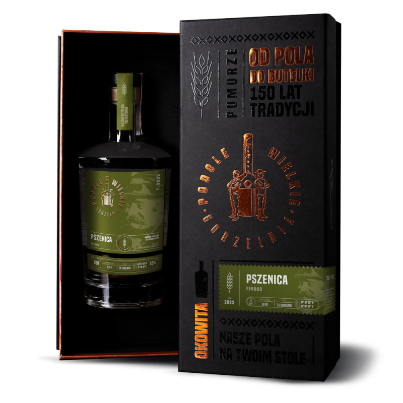 Podole Wielkie Okowita Pszenica - odmiana fidus z 2022 roku, w smaku rozpoznawalne są wyjątkowe akcenty toffi, orzechów laskowych i kakao. Okowita o wyrafinowanym bukiecie aromatycznym, charakteryzującym się nutami biszkoptu, śmietanki, masła, mleka i karmelu. Finisz tego rocznika jest krótki, lecz intensywny, wytrawny, ściągający, z delikatnym akcentem słoności. Rocznik 2022 okowit Podole Wielkie został dedykowany Panu Kazimierzowi Wejerowi.