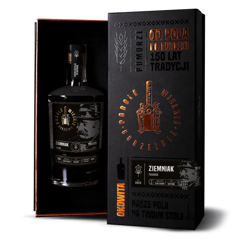 Podole Wielkie Okowita Ziemniak - odmiana taurus z 2022 roku, w smaku charakteryzuje się wyjątkową słodyczą, z warzywnymi tonami, w których można wyczuć bataty, seler oraz delikatne puree. Aromat z wyróżniającymi się nutami zielonego ziemniaka, krzaków ziemniaczanych, marchwi, chrzanu oraz ziemiste akcenty. Finisz tego rocznika jest intensywny, zdecydowanie botaniczny, konsekwentnie słodki, z subtelnymi nutami orzechów włoskich. Okowity Podole Wielkie 2022 zostały dedykowane Panu Kazimierzowi Wejerowi.