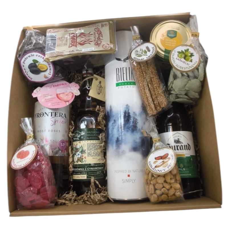 W zestawie znajdziesz wszystko, co kojarzy się z przyjemnym, świątecznym czasem: wódkę premium z możliwością osobistej dedykacji, likier, wino musujące, piwo oraz tradycyjne regionalne smakołyki.