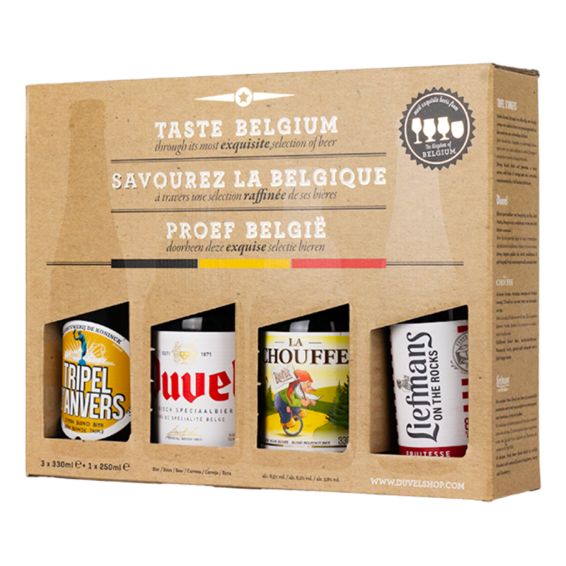TASTE BELIUM to wyjątkowy zestaw, który reprezenyuje różnorodność belgijskich stylów piwnych. Każda butelka oferuje unikalne doznania smakowe i aromatyczne. Zestaw zwiera: Tripel D’Anvers but. 0,33 l, alc. 8.0%, Duvel but. 0,33 l, alc. 8.5%, La Chouffe but. 0,33 l, alc. 8.0% oraz Liefmans but. 0,25 l, alc. 3,8%.