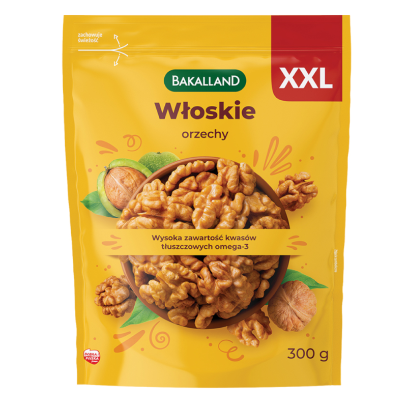 Orzechy włoskie Bakalland to najwyższej jakości orzechy, które charakteryzują się dużą zawartością kwasów tłuszczowych omega-3. W Polsce te orzechy zbiera się na początku jesieni, rosną na drzewach liściastych, które są jednymi z najbardziej popularnych drzew w naszym kraju. Cenione są za swoją długowieczność – dożywają nawet 500 lat. Jeśli zastanawiasz się, skąd wzięła się nazwa tego orzecha, to historia jest ciekawa, jednak nie ma nic wspólnego z Włochami. Te- bakalie dotarły do Polski z południowych części Karpat, które leżą na terenach Rumunii. Ten rejon historycznie nazywany był Włoszczyzną i dlatego orzech włoski zyskał tę właśnie nazwę. Bakalie te wyglądem przypominają mózg człowieka i mają na niego dobry wpływ. Orzechy te poleca się jeść osobom, które się uczą lub pracują umysłowo, ponieważ pomagają poprawić koncentrację oraz pracę mózgu. Orzechy włoskie to doskonałe źródło wielu wartościowych składników odżywczych. Warto je włączyć do swojego codziennego jadłospisu. Orzechy włoskie są dość kaloryczne, dlatego należy odmierzać zjadaną porcję, by nie przekroczyć swojego dziennego zapotrzebowania kalorycznego. Orzechy włoskie to produkt, który warto mieć w swojej kuchni. Doskonale sprawdzi się jako samodzielna przekąska – w szkole, w pracy, w przerwie od nauki. Jednak bakalie te są również cenne jako dodatek do śniadań na słodko takich jak: owsianki, jaglanki, granole, musli. Nadają daniom ciekawej chrupkiej struktury i charakterystycznego głębokiego smaku. Możesz wykorzystać orzechy również w czasie przygotowywania domowych wypieków takich jak: ciasto marchewkowe, snickers, pierniki, kruche ciastka orzechowe, tort orzechowy, mazurek kajmakowy no i oczywiście orzechowiec z charakterystycznymi miodowymi plackami. Dobrym sposobem, by przemycić więcej orzechów do codziennej diety, jest dodawanie ich do różnych sałatek. Orzechy włoskie to również doskonały dodatek do deski serów, idealnie komponują się z serami pleśniowymi. Możesz też wykorzystać bakalie w daniach obiadowych. Ciekawym pomysłem jest faszerowanie dyni lub cukinii orzechami. Jeśli przygotowujesz ryż z warzywami i kurczakiem, to świetnym chrupkim akcentem będą orzechy włoskie. Daj się ponieść fantazji i urozmaić swoją dietę o samo zdrowie, jakim są orzechy włoskie.
