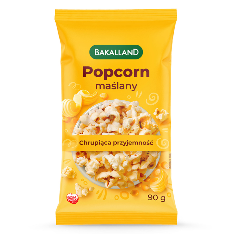 Popcorn maślany Bakalland to wyjątkowa przekąska. Maślany smak sprawia, że przekąska zyskuje delikatne i przyjemne nuty, który są wyraźnie wyczuwalne. Jest to kompozycja, która przypomina przekąskę znaną z kin. Zarówno jej aromat, jak i smak są zbliżone do tego przysmaku, który znamy z kina. Dlatego świetnie nadaje się na wieczór z filmem czy serialem. Miseczka tego smakołyku szybko znika przy oglądaniu. Jeśli zastanawiasz się, jak przygotować taki popcorn, to odpowiedzią jest kuchenka mikrofalowa. Wystarczy, że do kuchenki włożysz papierową torbę (napisem up do góry) na 2-4 minuty. Po uruchomieniu mikrofalówki będziesz słyszeć, jak ziarna się prażą. Po upływie tych kilku minut ostrożnie wyjmij torebkę, potrząśnij i gotowe. Możesz otworzyć opakowanie i zajadać się smaczną przegryzką. Popcorn maślany Bakalland to doskonała i smaczna przekąska dla wszystkich tych, którzy uwielbiają słone przegryzki. Świetnie sprawdzi się jako przekąska do filmu lub serialu, ale także jako smakołyk w pracy podczas przerwy do pochrupania razem z kolegami i koleżankami z pracy. Popcorn maślany to również świetna przekąska na różnego rodzaju spotkania z bliskimi, przyjaciółmi. Doskonale się sprawdzi podczas przyjęć dla dzieci, ponieważ najmłodsi również uwielbiają smak popcornu.