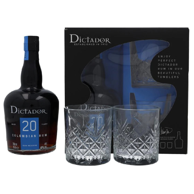 Dictador 20YO to synonim wytrawnego smaku. Rum starzony w dębowych beczkach po Bourbonie i Porto przez 20 lat wyróżnia się ciemno bursztynowym kolorem, słodkimi nutami cukru muscovado, smakiem wiśni i wanilii oraz mocnym akcentem czekolady. Butelka w zestawie z dwoma szklankami.