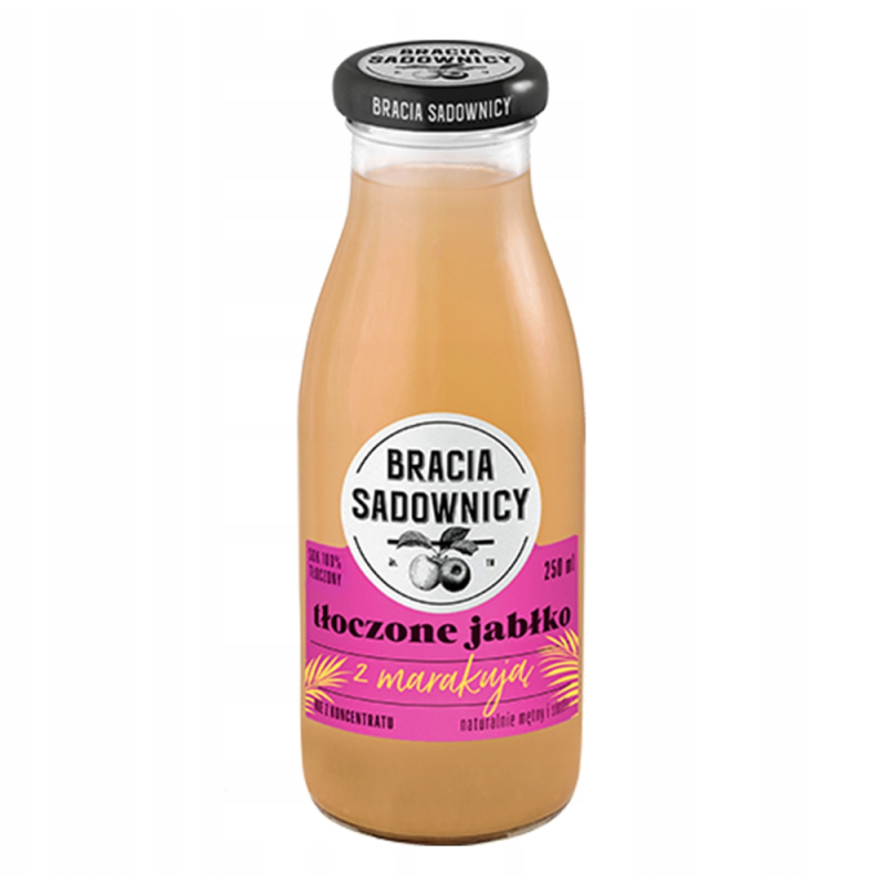 Bracia Sadownicy Tłoczone jabłko z marakują 250 ml. Nasz sok jest naturalnie słodki i mętny.