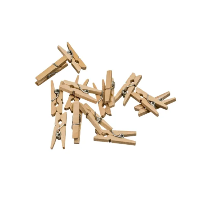 Miniaturowe klamerki z naturalnego drewna, doskonałe jako element uzupełniający dekorację szkła. Opakowanie zawiera 100 sztuk.