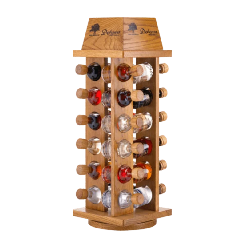 Stojak idealnie eksponuje kolekcję miniaturek Wódki Dębowej jako arystokratki wśród krajowych alkoholi. Mieści 24 szt. buteleczek 0,05l