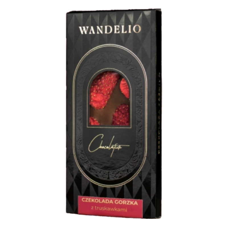 Gorzka czekolada z truskawkami – intensywna i owocowa przyjemność Ręcznie robiona gorzka czekolada Wandelio z liofilizowanymi truskawkami to połączenie głębokiego smaku 70% kakao z owocową świeżością i kwaskowatością truskawek. Każda tabliczka tworzona jest z naturalnych składników, bez dodatków chemicznych – tylko prawdziwa czekolada i owoce, które zachowały maksimum smaku i wartości dzięki liofilizacji. Dlaczego gorzka czekolada z truskawkami to zdrowy wybór? Wysoka zawartość kakao (70%) dostarcza cennych flawonoidów – przeciwutleniaczy, które chronią serce i układ krwionośny, Kakao wspiera pracę mózgu, koncentrację i dobre samopoczucie (dzięki magnezowi i teobrominie), Liofilizowane truskawki są źródłem witaminy C, błonnika i naturalnej kwasowości, która równoważy czekoladową głębię, Niski poziom cukru i czysty skład czynią ją idealną dla osób dbających o zdrowie. ??? Rzemieślnicza tabliczka Wandelio Każda tabliczka tworzona jest ręcznie w małych partiach, bez użycia lecytyny, konserwantów czy polepszaczy. Liofilizowane truskawki są starannie rozsypywane ręcznie na powierzchni jeszcze ciepłej czekolady, dzięki czemu każda porcja to idealna proporcja między owocową świeżością a gorzkim aromatem kakao. Skład i wartości odżywcze Składniki: Masa kakaowa, tłuszcz kakaowy, cukier trzcinowy, liofilizowane truskawki (6%), wanilia. Zawartość kakao: min. 70% Wartości odżywcze w 100 g: Energia: 525 kcal Tłuszcz: 39 g (w tym nasycone: 21 g) Węglowodany: 30 g (cukry: 21 g) Białko: 8 g Błonnik: 10 g Sól: 0,01 g Gramatura: 85 g