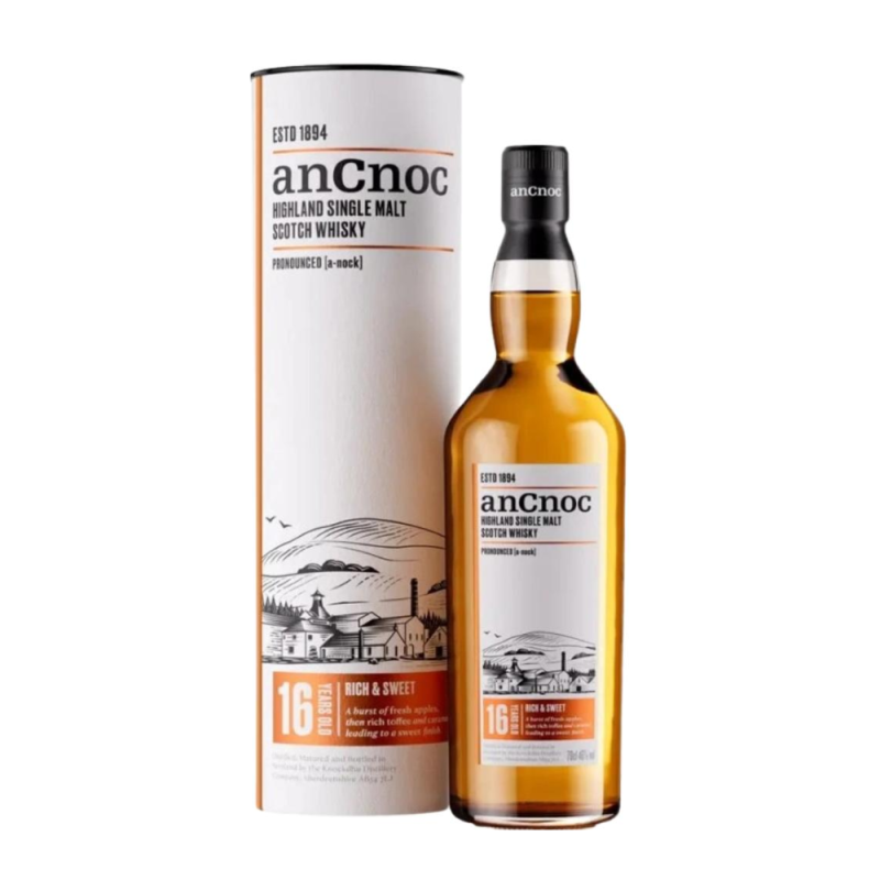 Przedstawiamy anCnoc 16 Year Old Single Malt, wyjątkowy trunek z destylarni Knockdhu, zlokalizowanej na skraju regionów Highland i Speyside. Ta elegancka whisky dojrzewała w całości w starannie dobranych beczkach po amerykańskim bourbonie przez minimum 16 lat. Jest to wydanie, które w pełni oddaje klasyczny, owocowo-cytrusowy styl destylarni.
