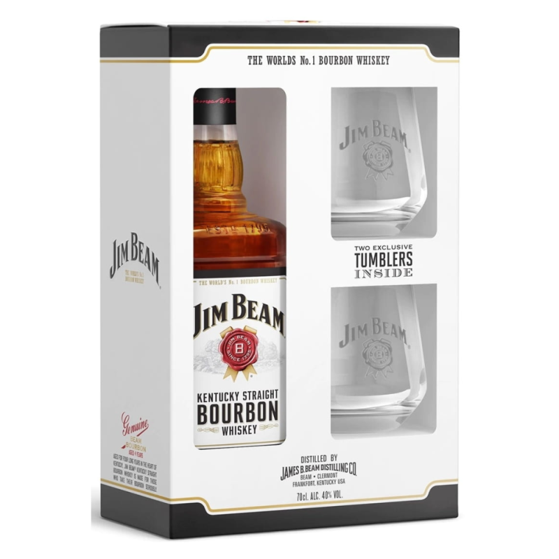 Zestaw zawiera nie tylko butelkę o pojemności 0,7 litra tej doskonałej whiskey, ale także 2 eleganckie szklanki z wyżłobionym logo Jim Beam. Amerykański bourbon, z którego słynie Jim Beam, powstaje z mieszanki zbóż, z zawartością kukurydzy na poziomie co najmniej 51%. Następnie trunki tej marki dojrzewają przez co najmniej 4 lata w nowych, opalanych ogniem beczkach z białego dębu, co nadaje im wyjątkowy charakter i smak.