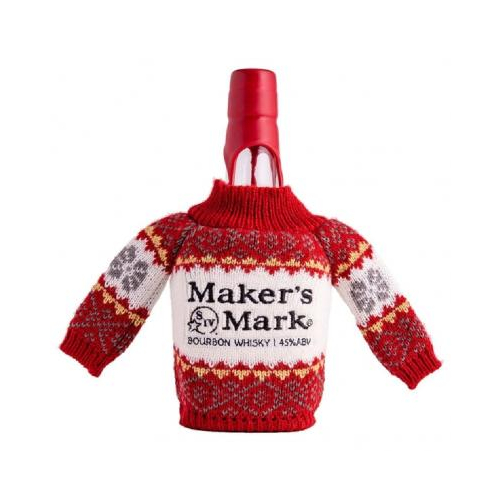 Charakterystyczna butelka z czerwonym lakiem została częściowo ukryta pod wełnianym, zimowym swetrem z logiem amerykańskiej marki. Ten kreatywny gest Maker's Mark sprawia, że bourbon jest idealnym świątecznym podarunkiem.