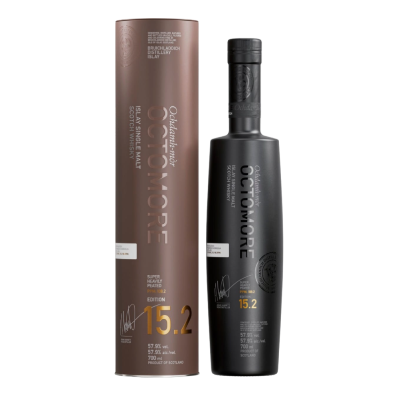 Octomore 15.2 57,9% to niezwykle złożona whisky single malt z Islay, która oferuje ekstremalny poziom torfowości, złożony profil smakowy oraz głębię wynikającą z dojrzewania w beczkach po winie Bordeaux. Z naturalną mocą beczki 57,9%, jest idealna dla koneserów szukających intensywnych doznań. Świetnie smakuje solo lub w towarzystwie wyrazistych dań, takich jak grillowane mięsa czy gorzkie czekolady. Ta limitowana edycja to prawdziwa gratka dla miłośników szkockiej whisky.