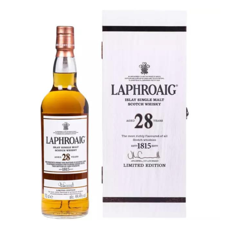 Poznaj wyjątkową whisky Single Malt Laphroaig 28Y Bottled 2018, butelkowaną z mocą 44,4%. Ta luksusowa 28-letnia whisky, produkowana przez renomowaną Laphroaig Distillery, oferuje niezwykle bogaty i złożony bukiet smaków. Wyraźne nuty torfu, dymu, suszonych owoców, wanilii i subtelnych przypraw harmonijnie łączą się w każdej kropli, tworząc niezapomniane doznania smakowe. Butelkowana w 2018 roku, Laphroaig 28Y to prawdziwy skarb dla miłośników whisky single malt, idealny na wyjątkowe okazje.