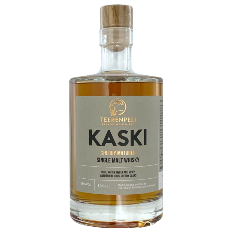 KASKI dojrzewa tylko w wyselekcjonowanych beczkach po sherry, dzięki czemu ma kolor prażonego brązowego cukru. Zapach ma nuty owocowe i lekki torf. Smak jest gładki, ziarnistyi bogaty. Typowy pikantny posmak destylarni Teerenpeli łączy w sobie rodzynkowe ciasto owocowe.
