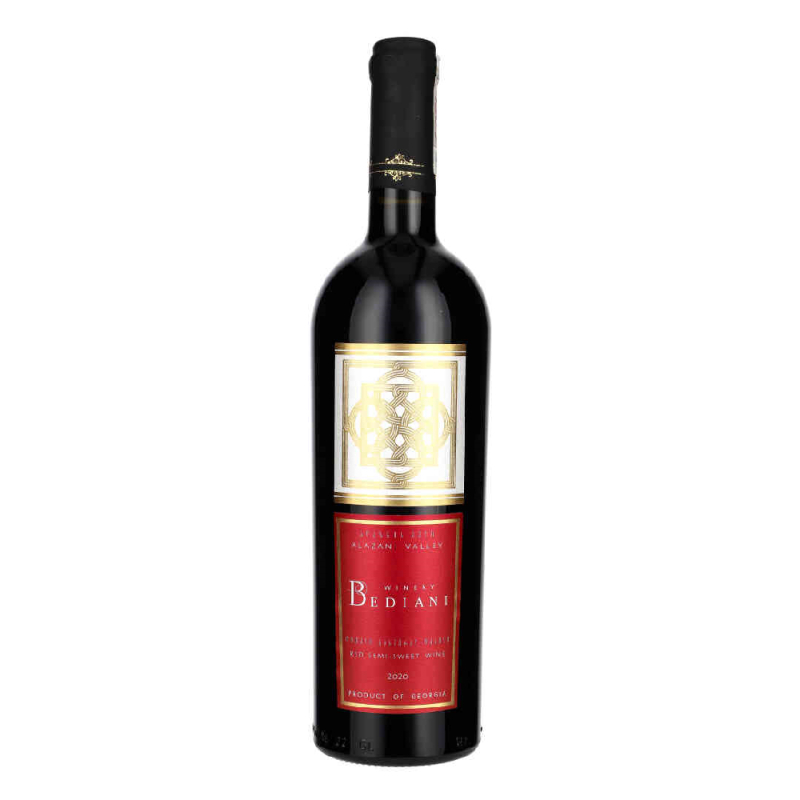 Ręczny zbiór bardzo dojrzałych winogron. Po oddzieleniu od szypułek jagody są delikatne tłoczone i poddawane fermentacji na naturalnych drożdżach w kadziach ze stali nierdzewnej, w kontrolowanej temperaturze. Czerwone wino naturalnie półsłodkie, wyprodukowane z winogron Saperavi.