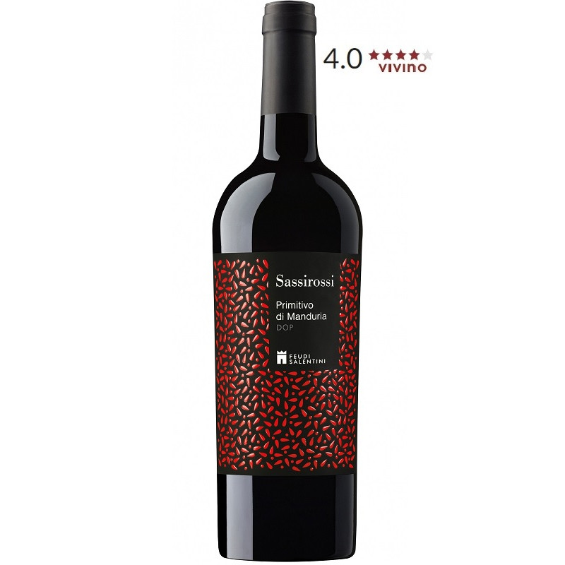 Sassirossi to czerwone, wytrawne wino wykonane w 100% z gron szczepu Primitivo we włoskim regionie Apulia. Winogrona używane do produkcji tego wina pochodzą z najstarszych winnic położonych w sąsiedztwie Morza Jońskiego. Wino dojrzewa przez 8 miesięcy w 225 litrowych dębowych beczkach. To wino z winnicy Feudi Salentini cechuje się rubinowym kolorem z fioletowymi refleksami i bardzo intensywnym, pełnym smakiem. Dominują aromaty dżemu owocowego, czarnej porzeczki, kakao i lukrecji. Wino o idealnie zintegrowanych taninach. Polecamy do dań kuchni włoskiej, grillowanych mięs i mięsnych sosów.