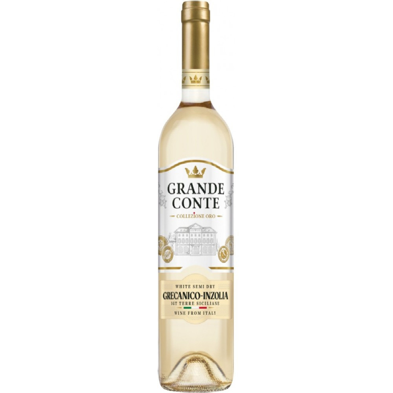 Wino z Włoch białe półwytrawne. Grande Conte Grecanico-Inzolia to kompozycja dwóch endemicznych sycylijskich szczepów o ciepłej słomkowej barwie z jasnozielonymi odcieniami. W aromatach dojrzałe gruszki i grapefruit. W smaku pełne, rześkie z orzeźwiającą kwasowością. Idealne jako aperitif oraz do jasnych mięs, makaronów w kremowych sosach, lekkich sałatek, kozich serów. Serwować w temperaturze 8-10°C.