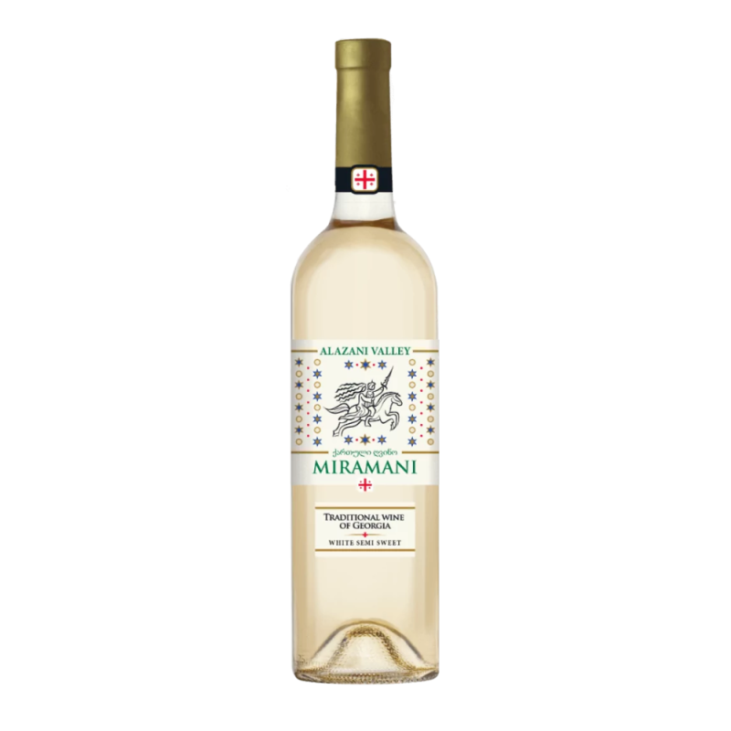 Miramani Alazani Valley produkowane jest z najlepszych w regionie szczepów – Rkatsiteli, Kisi oraz Kakhuri Mtsvane. Charakteryzuje się bladosłomkową barwą. Bardzo harmonijny aromat. W smaku dzikie kwiaty, miód oraz nuty akacji. Idealnie sprawdza się jako aperitif, pasuje do serów pleśniowych, delikatnych deserów i sałatek owocowych. Serwować w temperaturze 10-12°C.