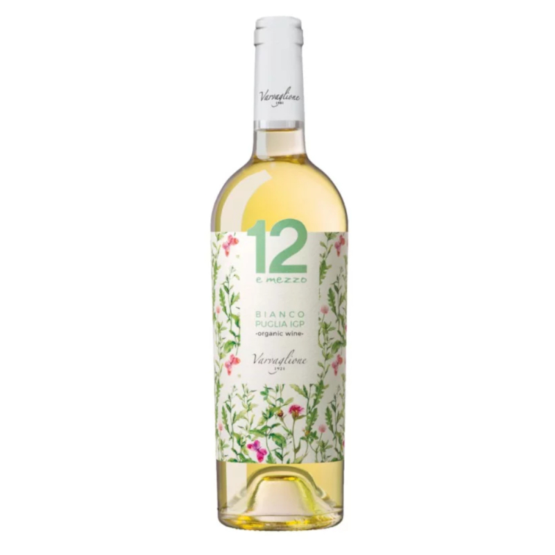 Białe wino wytrawne z organicznej uprawy winorośli szczepów: malvasia, verdeca, chardonnay.
