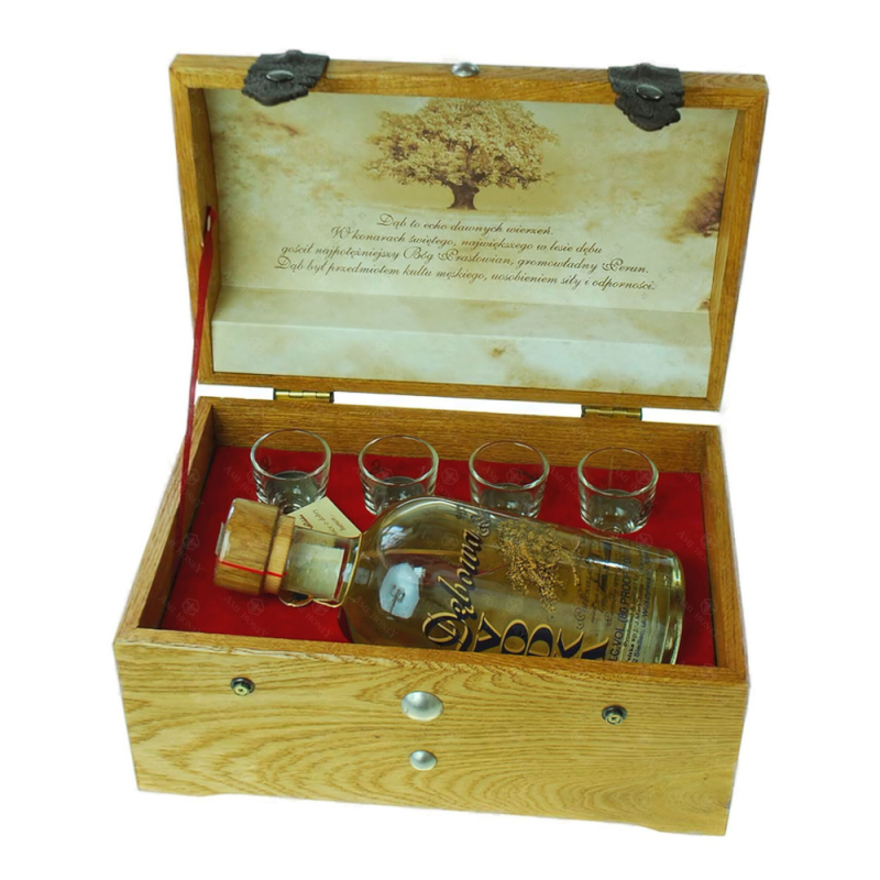 Wódka Dębowa Polska wytwarzana jest zgodnie z tradycyjną polską recepturą z najwyższej jakości spirytusu zbożowego oraz krystalicznie czystej wody. W środku każdej butelki umieszczane jest pasemko drewna dębowego, które uszlachetnia aromat i barwę tego wyjątkowego trunku. Jakość i smak Dębowej Polskiej nie mają sobie równych. Idealne na prezent.