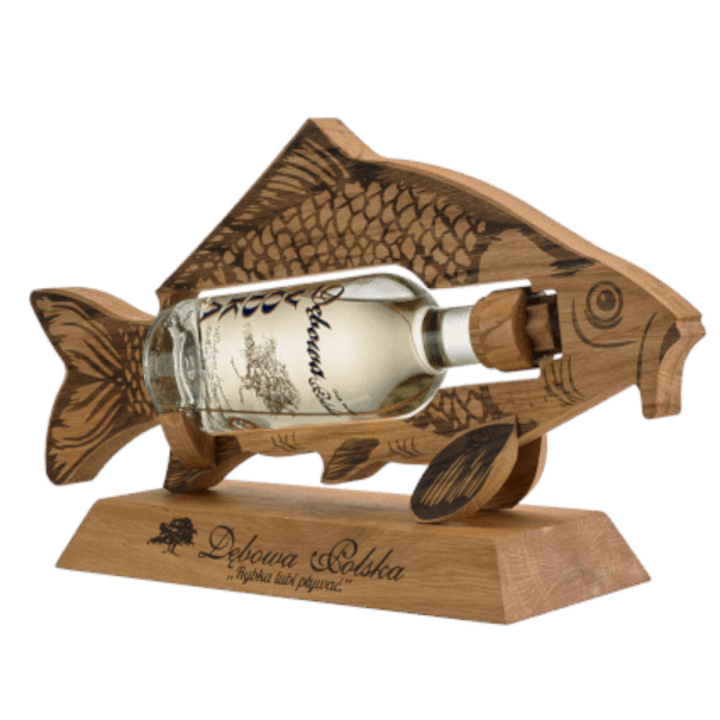 Karpik z Wódką Dębowa Polska to ciekawy, przykuwający wzrok zestaw, w którym drewniana figurka ryby pełni rolę stojaka dla klasycznej i szlachetnej wódki Dębowa Polska. To połączenie prostego, naturalnego drewna z trunkiem sprawia, że produkt świetnie sprawdzi się jako wyjątkowy upominek.