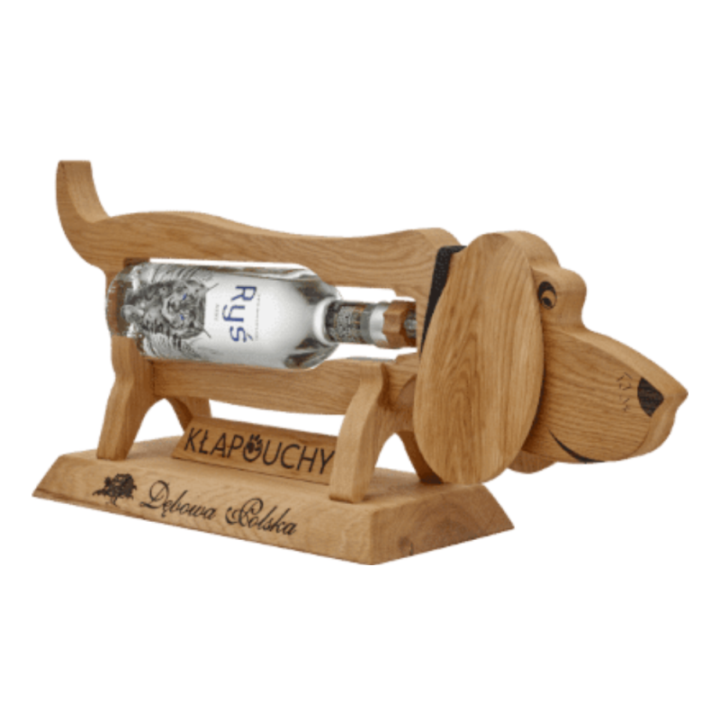 Kłapouchy to stojak na alkohol z litego drewna dębowego, w formie sympatycznego, wzbudzającego uśmiech psa z oklapniętymi uszami. W środku znajduje się butelka krystalicznie czystej wódki Ryś, a całość osadzona jest na solidnej podstawie z grawerem Dębowa Polska. Każdy egzemplarz jest unikatowy dzięki naturalnemu usłojeniu drewna. Idealny na prezent lub jako oryginalna ozdoba domowego barku.