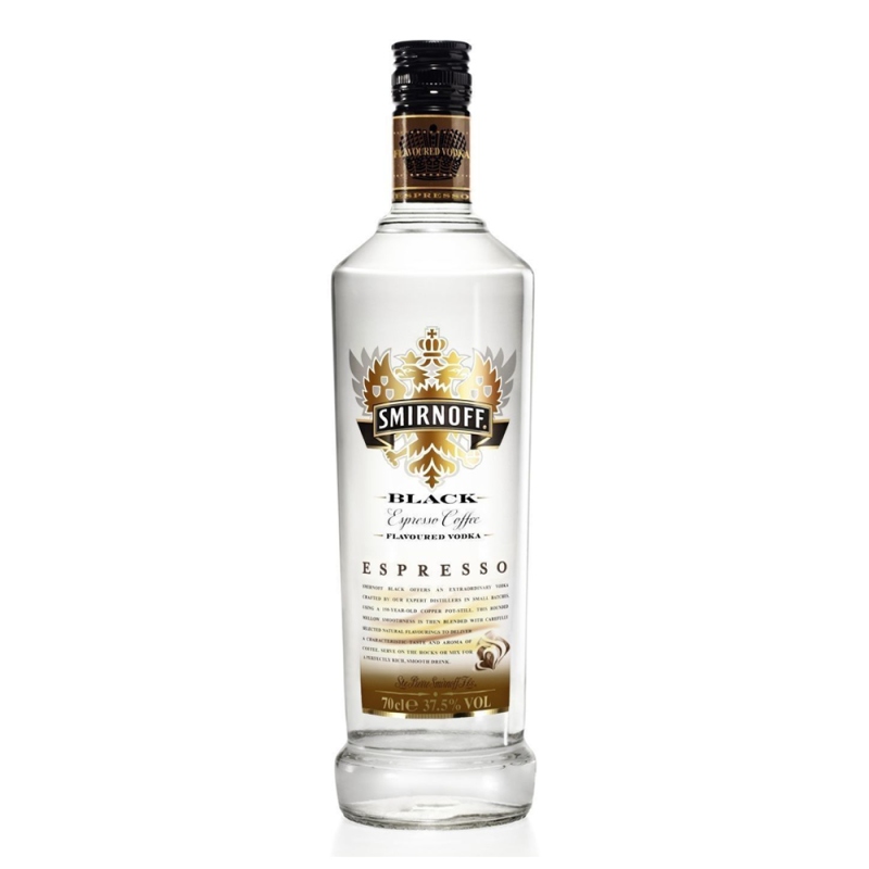 Wódka Smirnoff Black w najnowszej odsłonie z dodatkiem aromatu prawdziwego włoskiego espresso. Intensywny i zarazem łagodny trunek elektryzujący pozytywną energią, w smaku przypomina nieco likier kawowy. Smirnoff Espresso doskonale smakuje na czysto, oraz jako składnik drinków. Wspaniale będzie pasować też do Tiramisu.