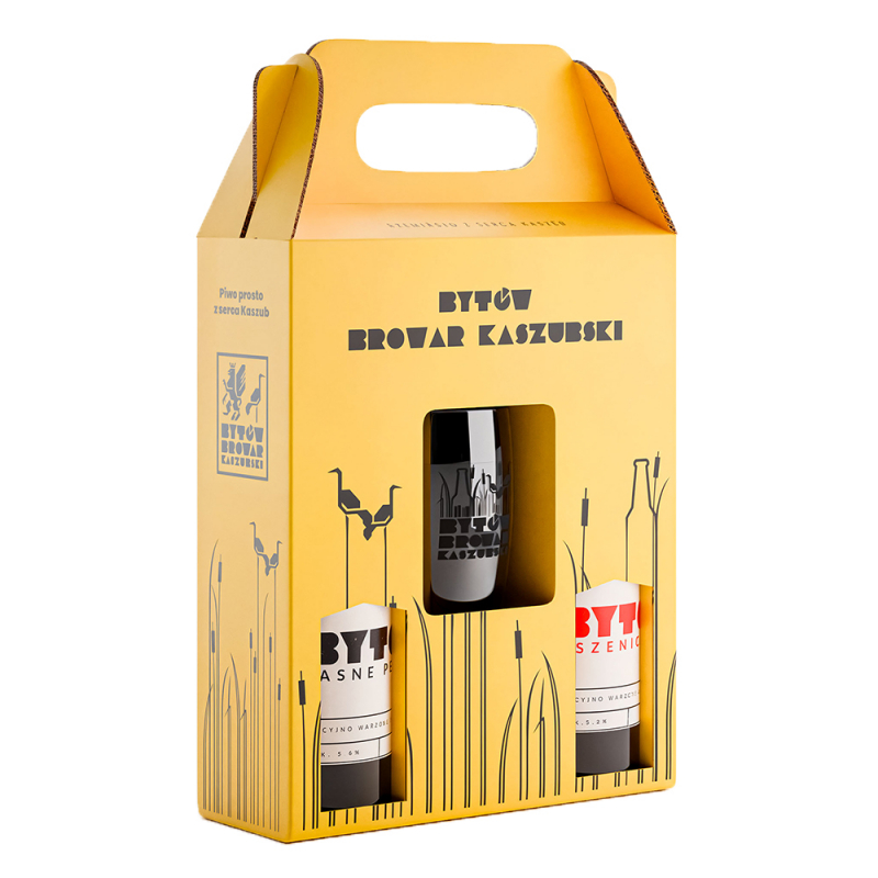W skład zestawu wchodzą dwa piwa Bytów i szklanka.